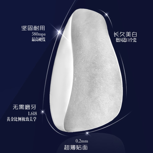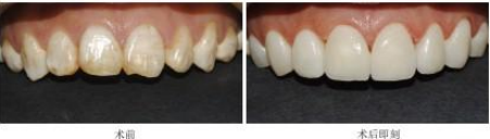 瓷贴面对氟斑牙、轻中度四环素牙、轻微牙齿排列不齐等牙齿问题有着优良的美白效果,并且对患者牙齿损伤最小。